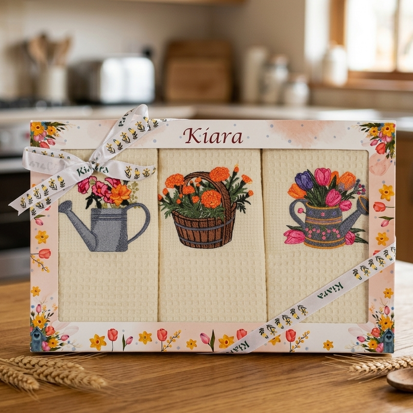 Táto prekrásna darčeková sada kuchynských utierok oživí každú kuchyňu a je perfektný spôsob, ako dodať domovu nádych jarnej radosti a elegancie. Sada obsahuje tri krémové waffle utierky s detailnou kvetinovou výšivkou, elegantne zabalené v dekoratívnej darčekovej krabičke. Scéna, v ktorej je krabička položená na drevenom stole s rozmazaným kuchynským pozadím, podčiarkuje jej domáci a útulný charakter.
