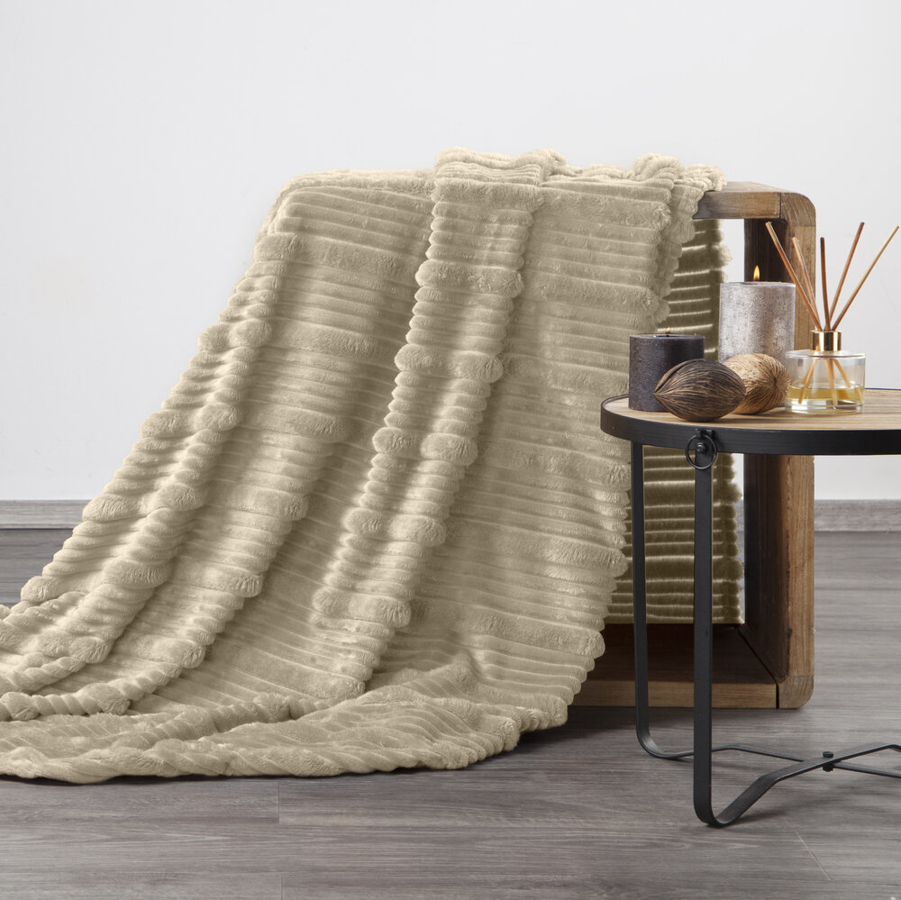 Táto flísová deka flano kombinuje pohodlie a moderný dizajn. Mäkká, na dotyk príjemná flísová tkanina zaručuje teplo a pohodlie, zatiaľ čo reliéfny vzor horizontálnych pruhov s 3D efektom dodáva eleganciu a jedinečný charakter. Nie je to len praktická deka, ale aj štýlový dekoratívny prvok, ktorý vylepší vzhľad vášho interiéru.