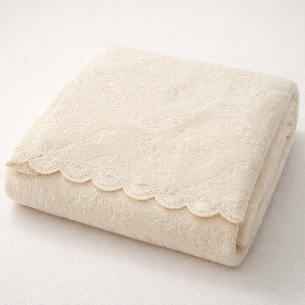 Dekorovaný povrch s elegantným ornamentálnym vzorom dodáva deke luxusný vzhľad. Okraje sú tepelne upravené do jemnej vlnky, bez klasického obšívania, čo zabezpečuje čistý a estetický detail aj dlhú životnosť.