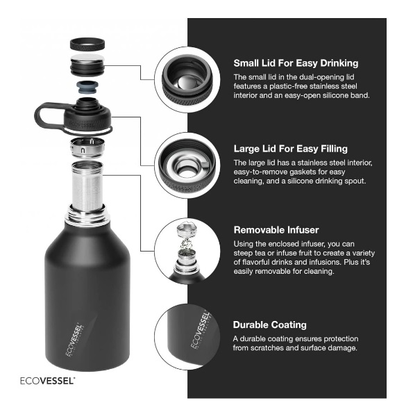 Dvojitý uzáver má široké hrdlo pre ľahšie plnenie a údržbu a úzke hrdlo pre pohodlné pitie.
