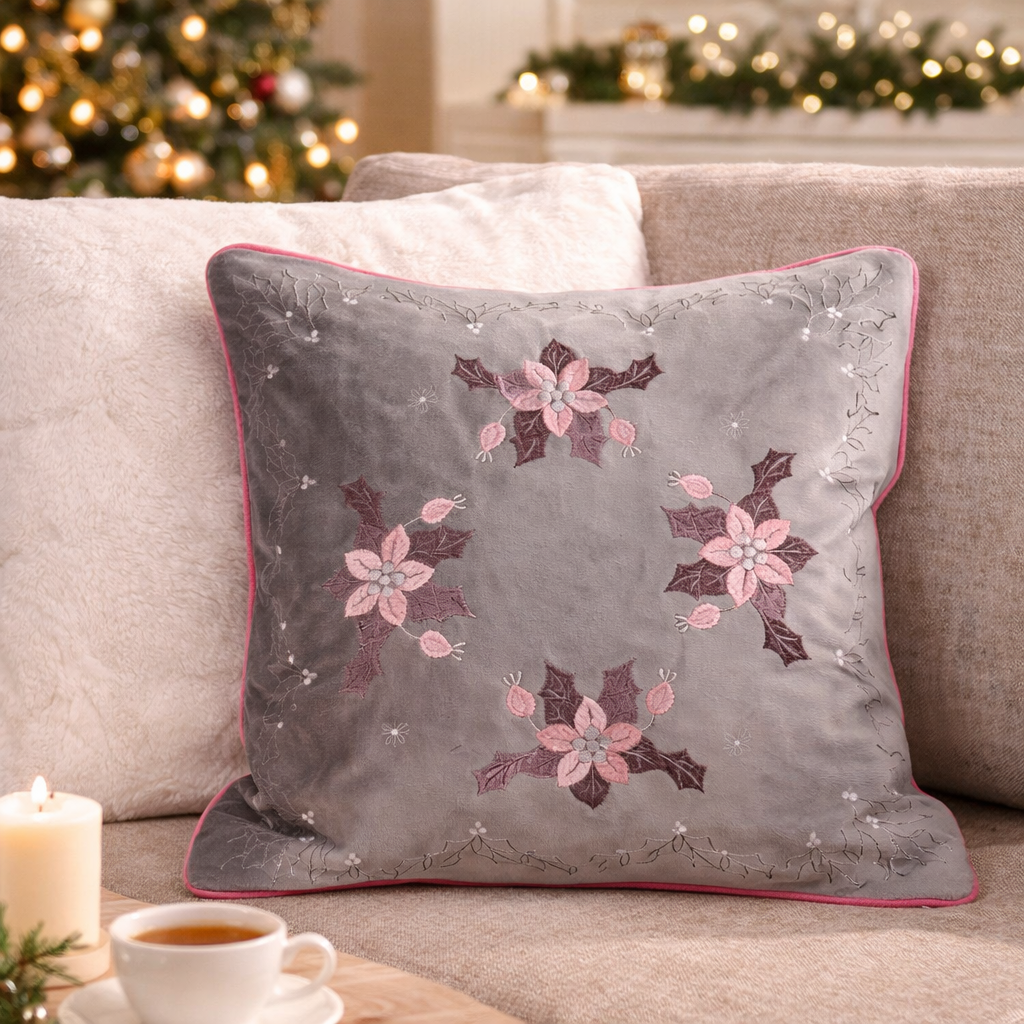 Vianočná zamatová obliečka na vankúš ŠÍPKY 0082/1 sivá s výšivkou