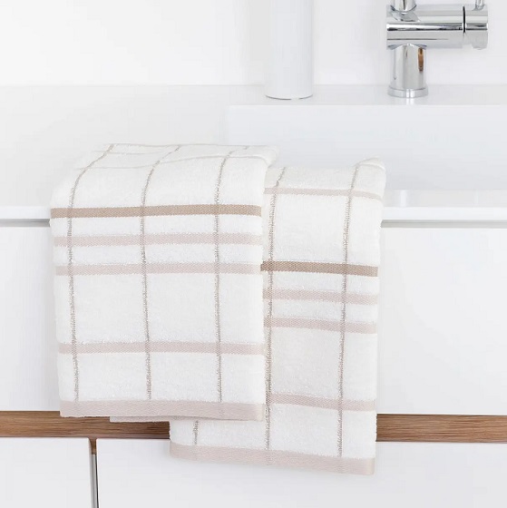 Kuchynské utierky Megan zdobia elegantný kockovaný motív vo farebne zladených tónoch, ktorý je vďaka vtkanej štruktúre viditeľný z oboch strán slučkového froté. Utierky sú navrhnuté tak, aby mali ideálne absorpčné vlastnosti a súčasne rýchlo schli. Utierky sú zo všetkých štyroch strán lemované a sú opatrené praktickým pútkom.