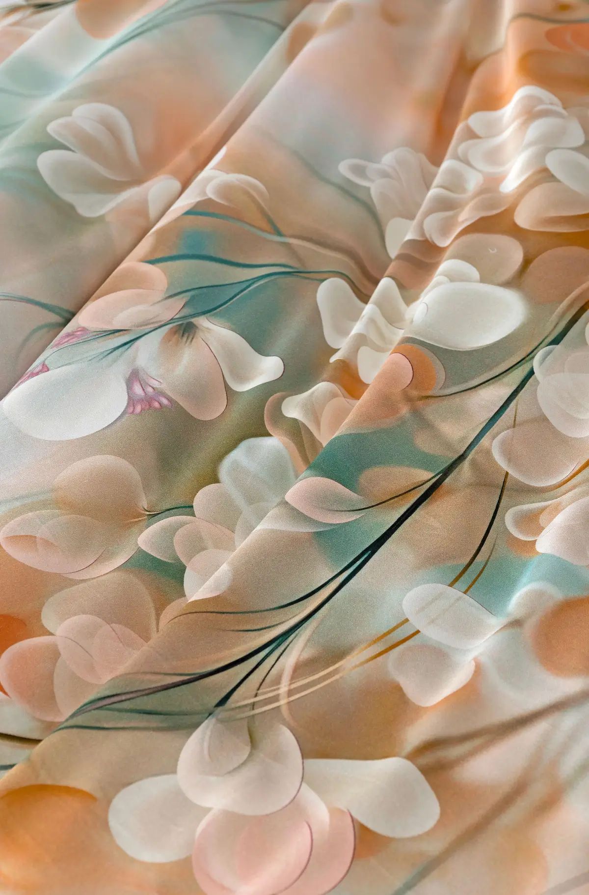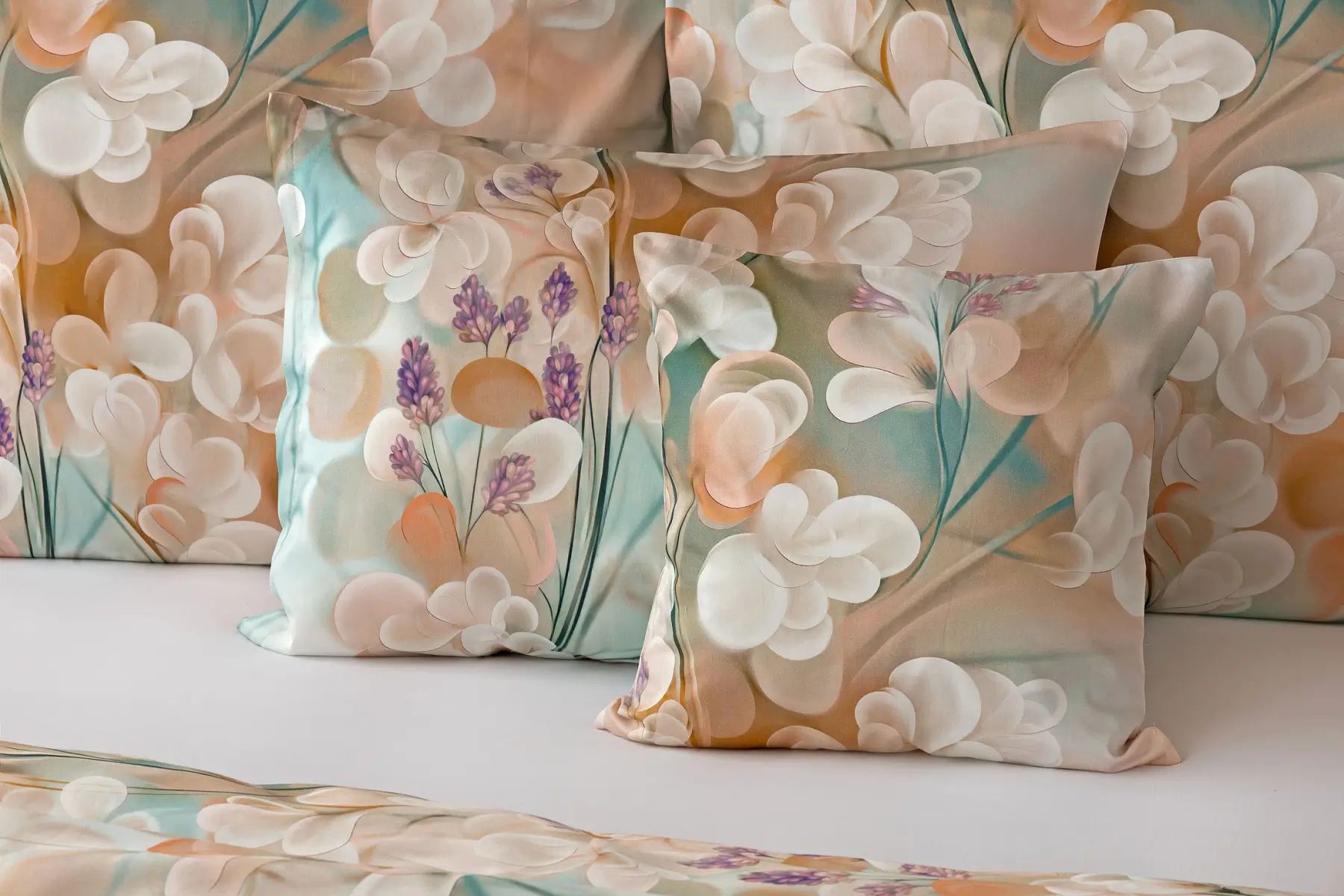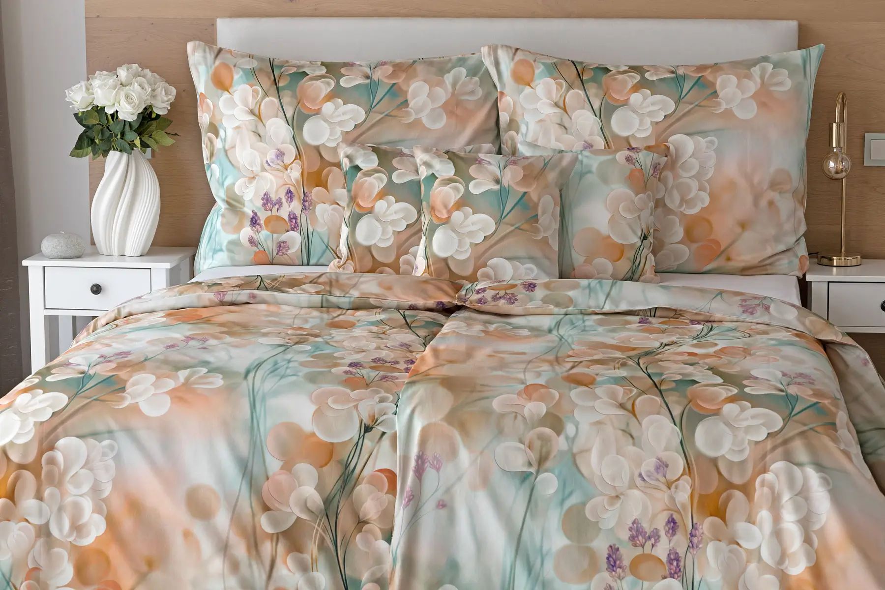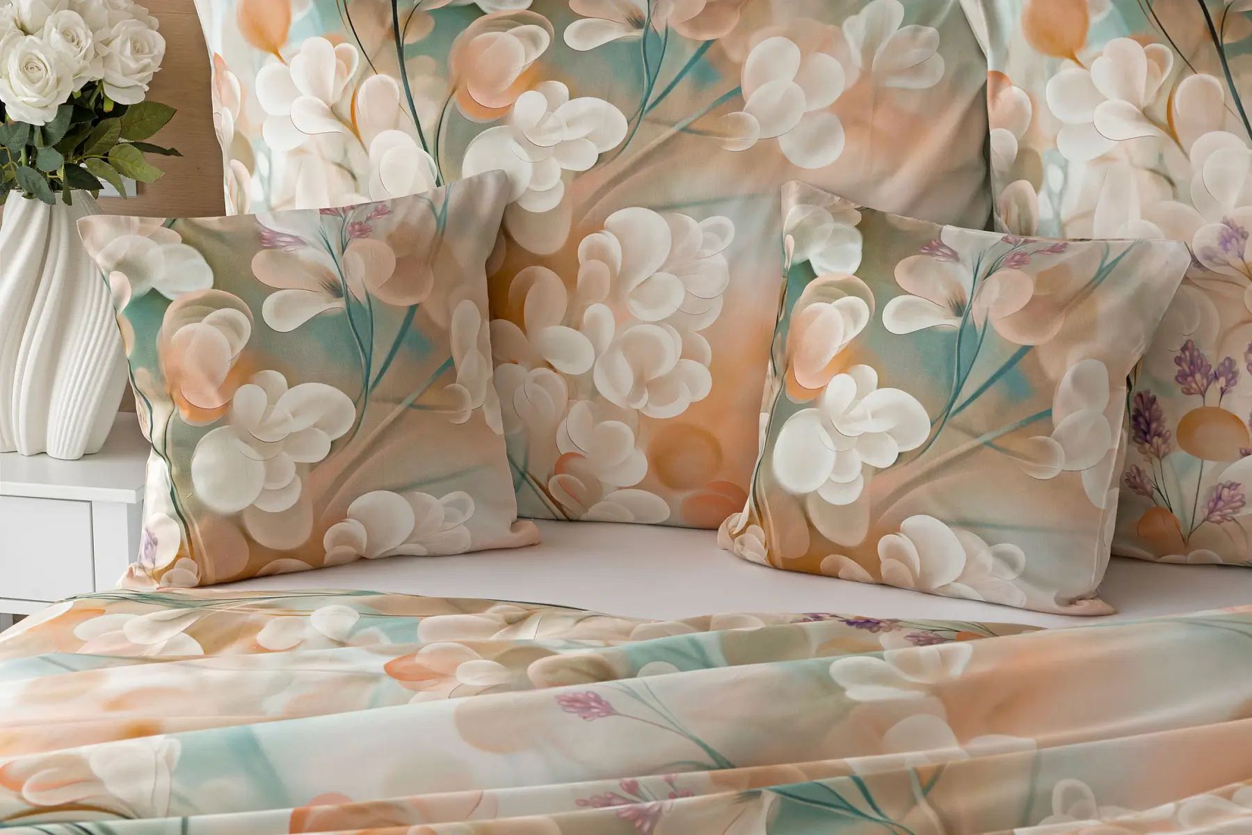 Popis vzoru:Vdýchnite svojej spálni sviežosť a nadčasový vzhľad s posteľnou bielizňou Lunaris. Jemný florálny motív v harmonickom spojení krémových, oranžových a svetlo tyrkysových tónov pôsobí vzdušne a štýlovo. Vďaka najmodernejšej digitálnej tlači vyniká vzor v čistých líniách aj jemných detailoch. Hebký bavlnený satén dodáva obliečkam decentný lesk, ktorý tomuto dizajnu veľmi pristane.