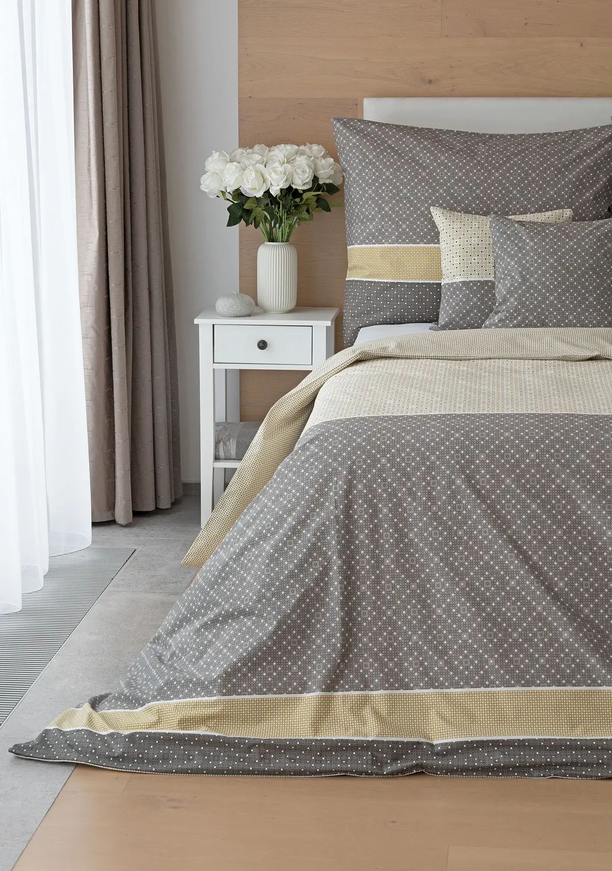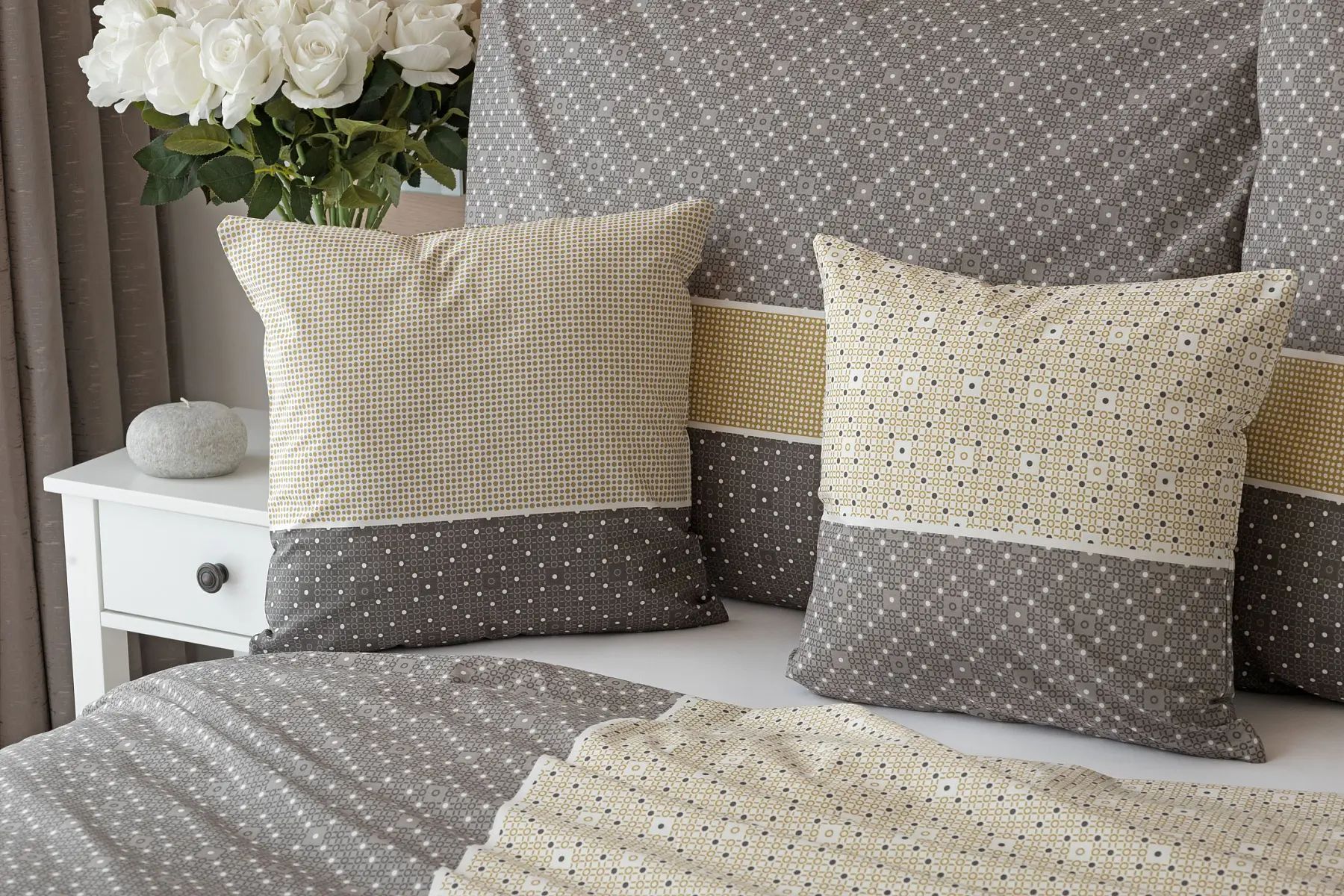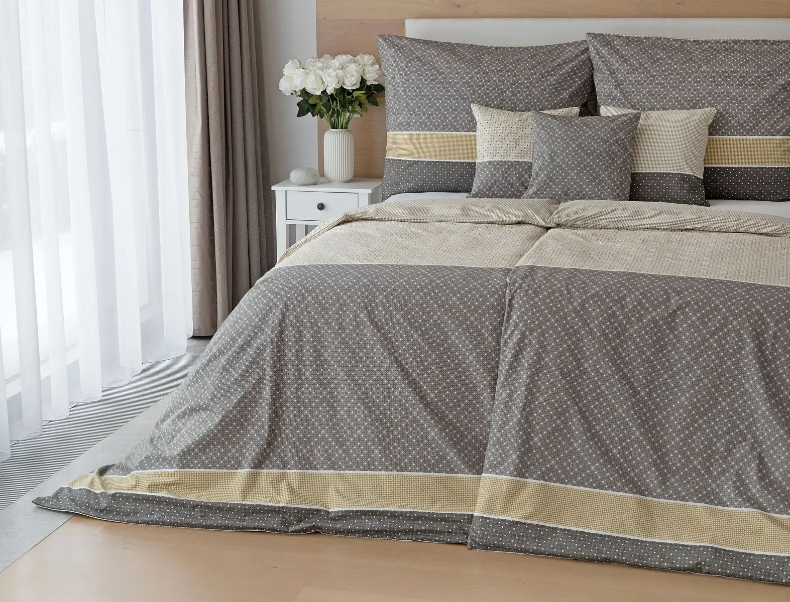 Popis vzoru: Bavlnené obliečky Maddox zaujmú pestrým geometrickým motívom, ktorý pracuje s hrejivou farebnou škálou od jemnej prírodnej béžovej až po hlbokú antracitovú sivú. Jednotlivé tvary sú citlivo skombinované do harmonického a elegantného celku, ktorý ponúka pri ustielaní priestor na hravé kombinovanie. Lícna strana obliečok zodpovedá prevedeniu na fotografii, zatiaľ čo rubová strana je ladená do minimalistického dizajnu s drobnými bodkami v sivých a okrových odtieňoch na béžovom pozadí, čo dodáva obliečkam variabilitu a nadčasový charakter.