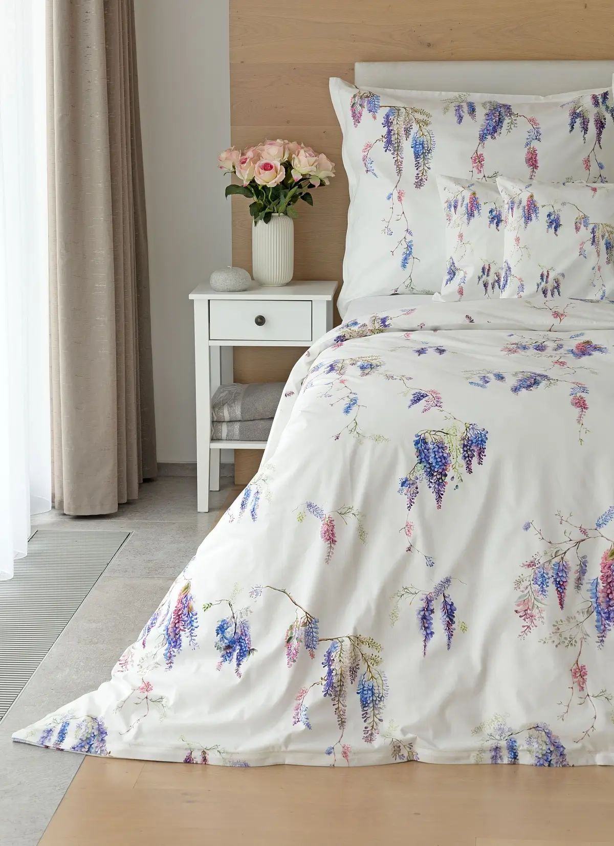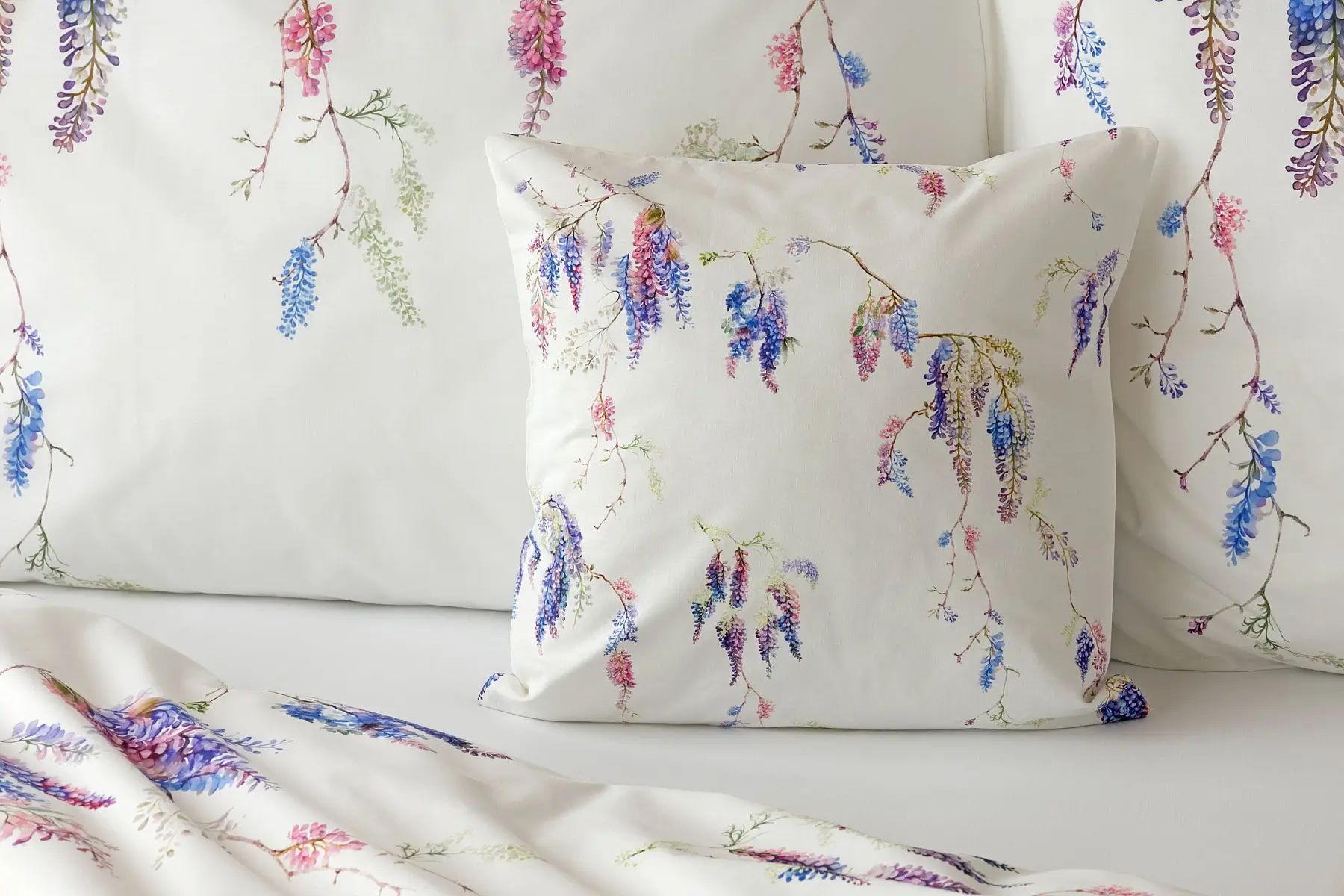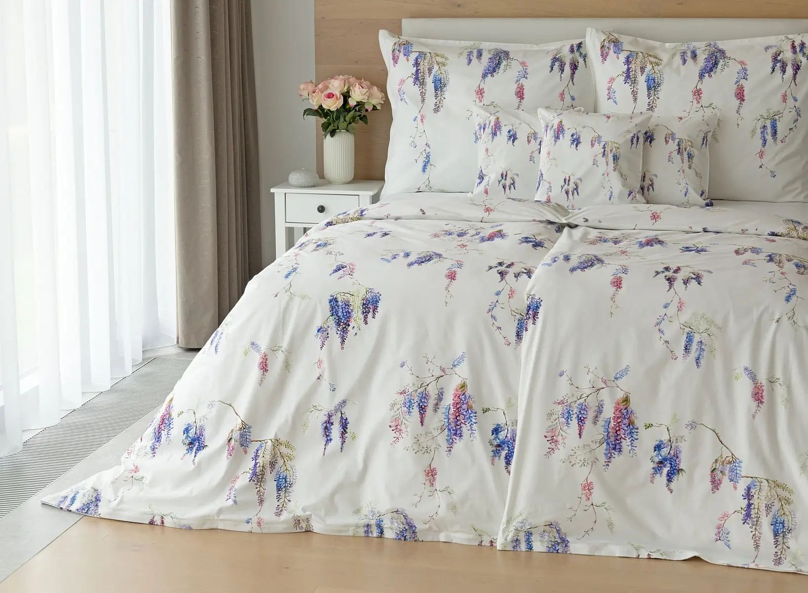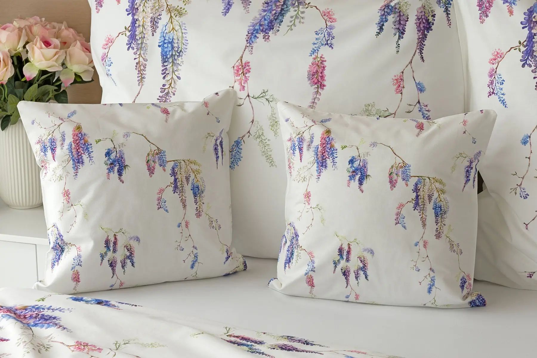 Popis vzoru: Bavlnené obliečky Wisteria s nežným kvetinovým motívom vás nadchnú svojou jednoduchou krásou. Fialovo-ružové kvety vistérie vynikajú na snehovo bielom podklade, ktorý podčiarkuje čistotu a eleganciu tohto romantického vzoru.
