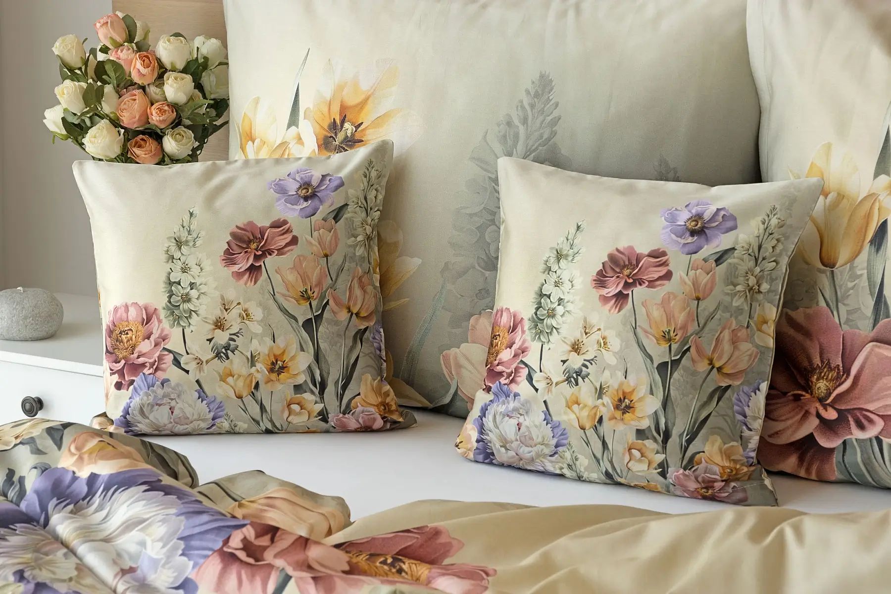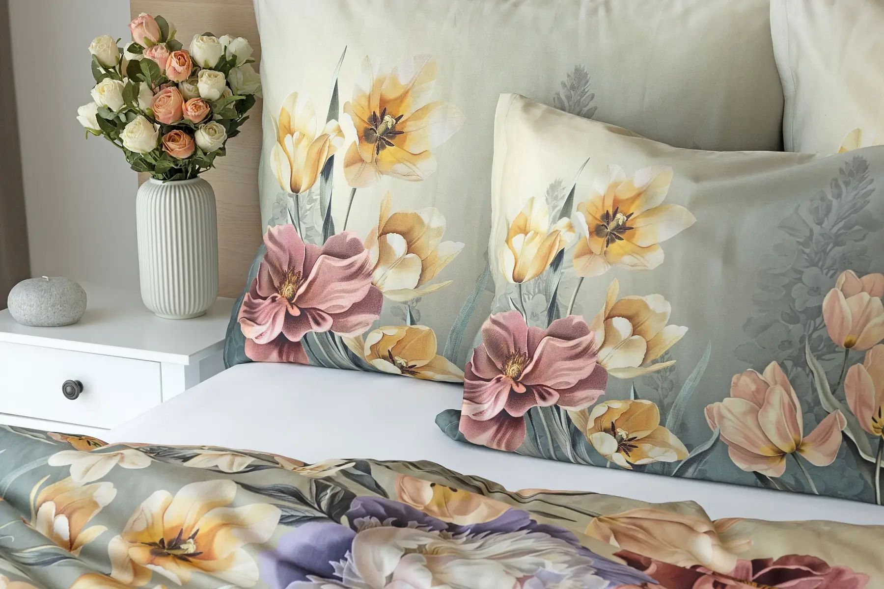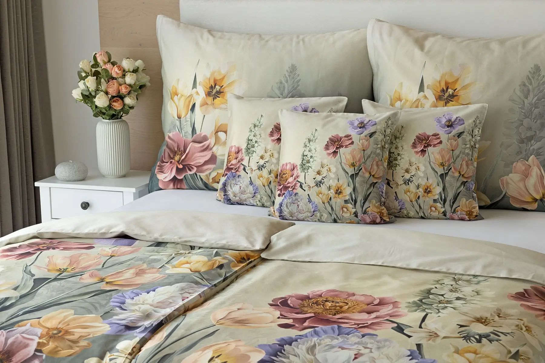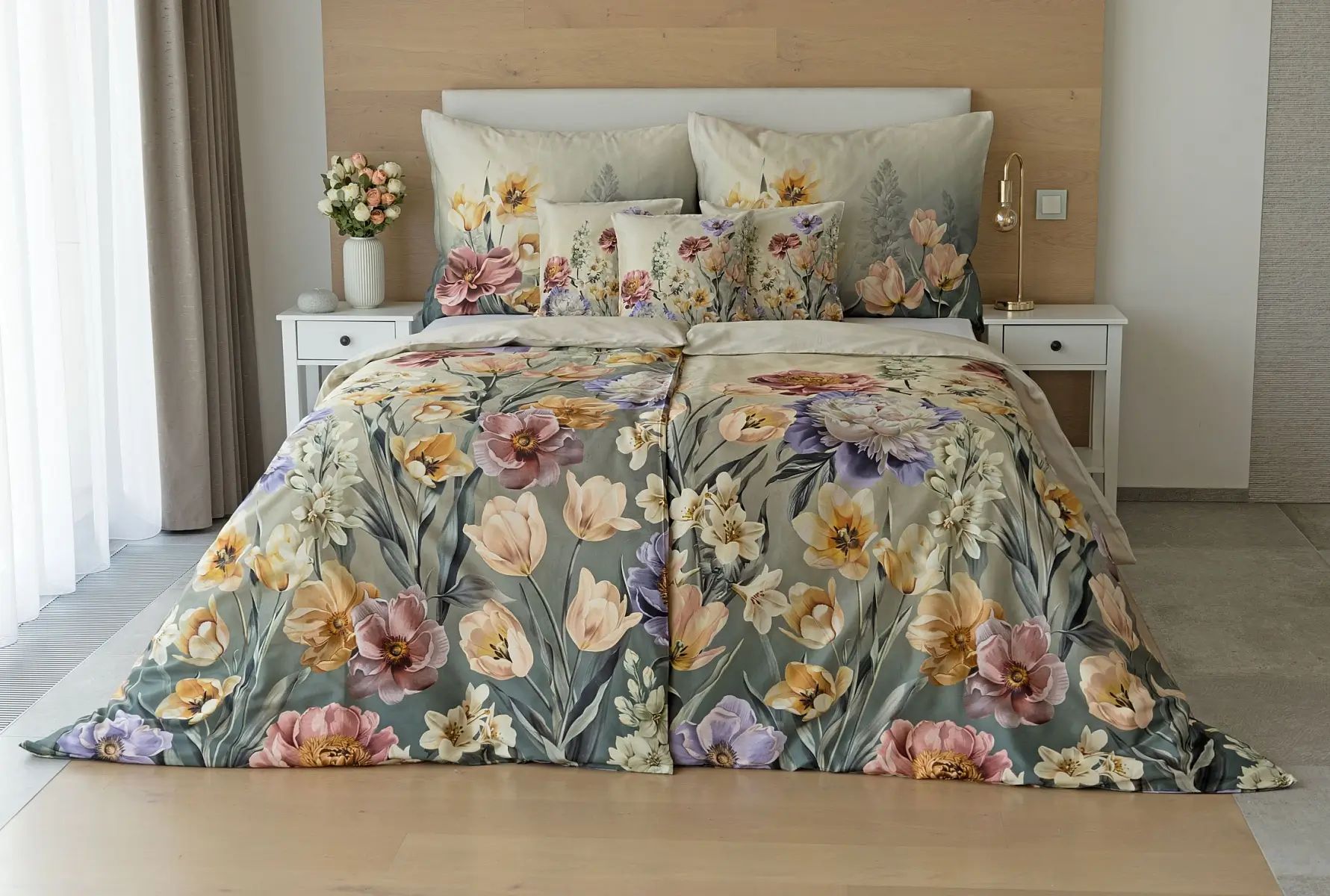 Popis vzoru: So saténovými obliečkami Elara vaša spálňa rozkvitne do krásy. Farebné kvety vlčích makov vynikajú na modrozelenom podklade, ktorý prechádza v hornej časti obliečky do tlmeného zelenošedého tónu. Vďaka najmodernejšej digitálnej tlači vyniká kvetinový vzor v precíznom detaile.