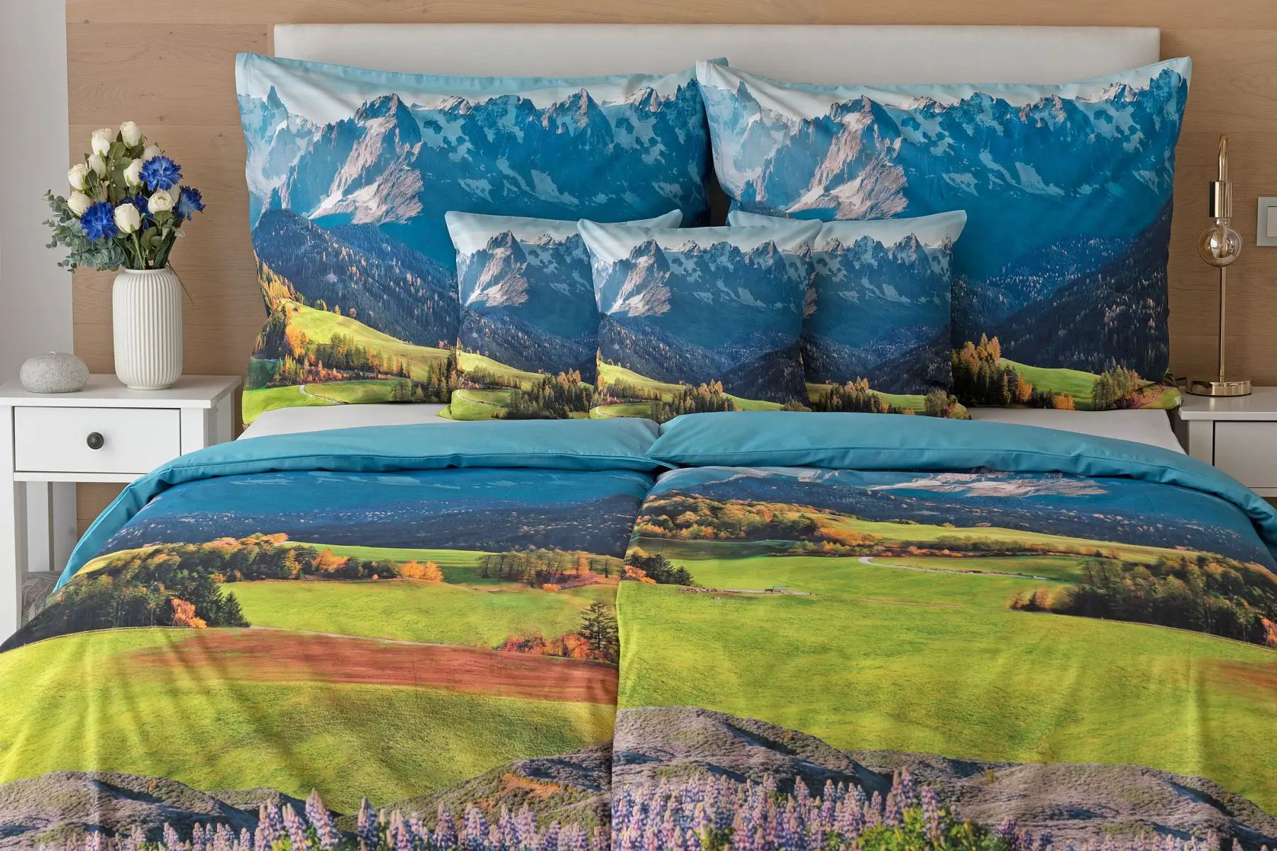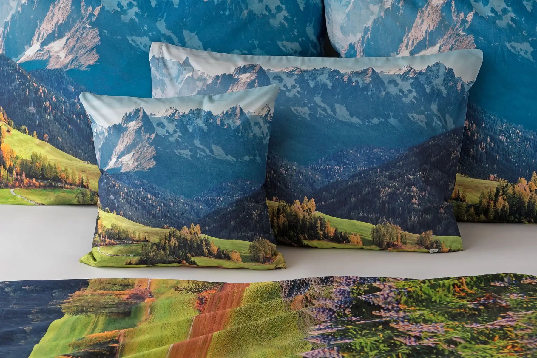 Popis vzoru: Posteľné obliečky Hory s panoramatickým motívom horskej krajiny vnesú do vašej spálne pocit slobody, pokoja a prepojenia s prírodou. Rozkvitnuté lúky, zelené svahy a majestátne horské štíty vytvárajú harmonickú scenériu. Sýte farby a detailná tlač dodávajú obliečkam prirodzený charakter, vďaka ktorým sa stanú dominantou interiéru. Ideálna voľba pre milovníkov prírody, hôr a cestovania. Doprajte si každý večer pocit, ako by ste zaspávali uprostred rozkvitnutej horskej krajiny.