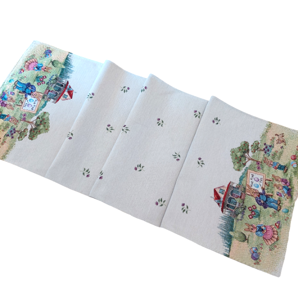 Veľkonočný jarný 45x140 cm behúň - šerpa 1184 Zajkovia pri domčeku