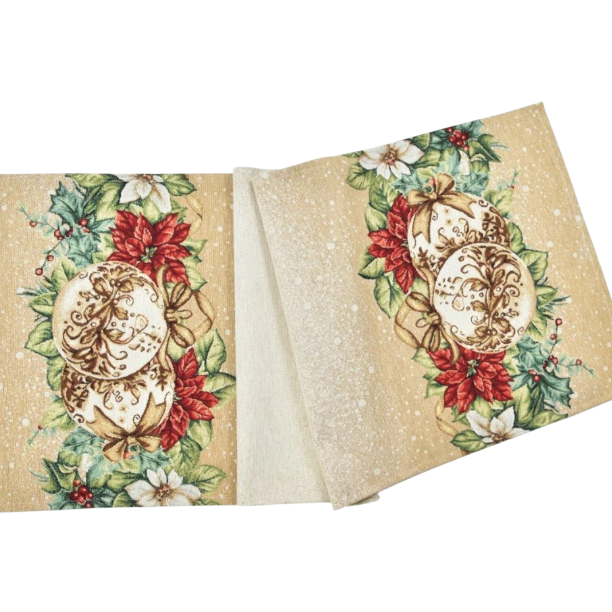 Gobelinový obrus s elegantným motívom zlatých vianočných gúľ a červených vianočných hviezd (poinsettia) je nádherným doplnkom pre váš sviatočný interiér. Jemné béžové pozadie so zasneženým efektom dodáva dizajnu luxusný a zároveň hrejivý vzhľad. Je vyrobený z kvalitného gobelínového materiálu, ktorý je odolný a trvácny, pričom pôsobí veľmi dekoratívne a útulne.